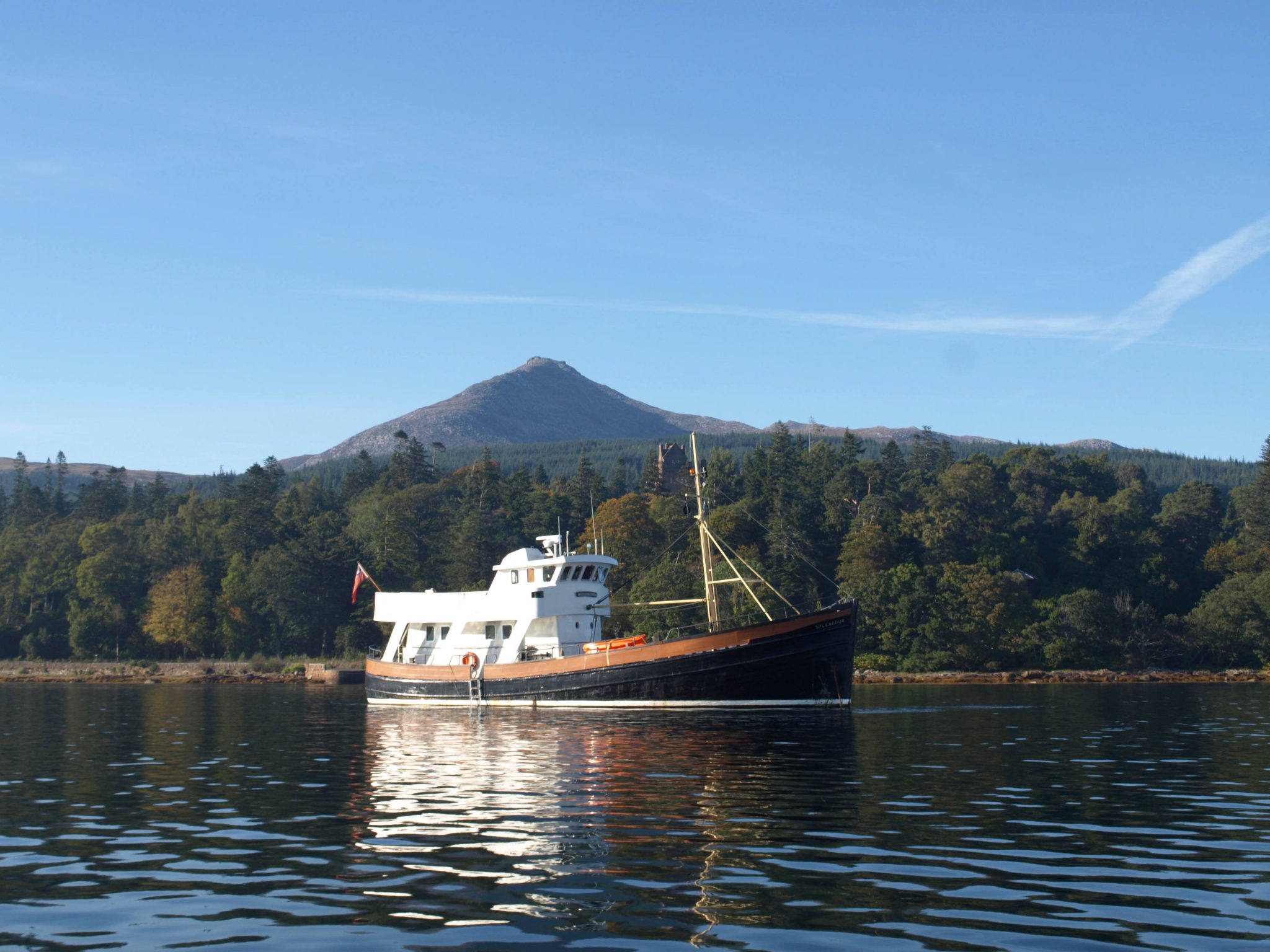 The exceptional autumn weather in Scotland had tempted me to take a short break on the west coast and I found myself aboard “Splendour”, on a gloriously sunny late September afternoon. We were setting off from Holy Loch, only an hour from Glasgow, but in another world of serene scenic beauty with the surrounding mountains reflected in the mirror calm waters of the loch.